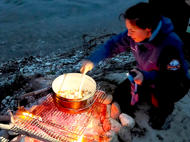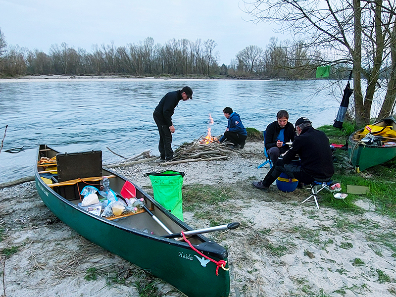 Am nächsten Morgen packen wir unsere Boote mit Campingausrüstung und Verpflegung für die kommenden Tage. Entlang des Flusses paddeln wir und schlagen unser Camp an den schönsten Plätzen auf – sei es auf Kiesbänken oder in ruhigen Flussauen. Diese Zeit in der Natur ermöglicht es uns, Freiheit und Abenteuer in vollen Zügen zu geniessen. Abends treffen wir uns am Lagerfeuer, um unsere gemeinsamen Erlebnisse zu teilen und leckere Gerichte zuzubereiten.