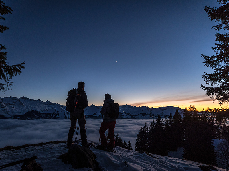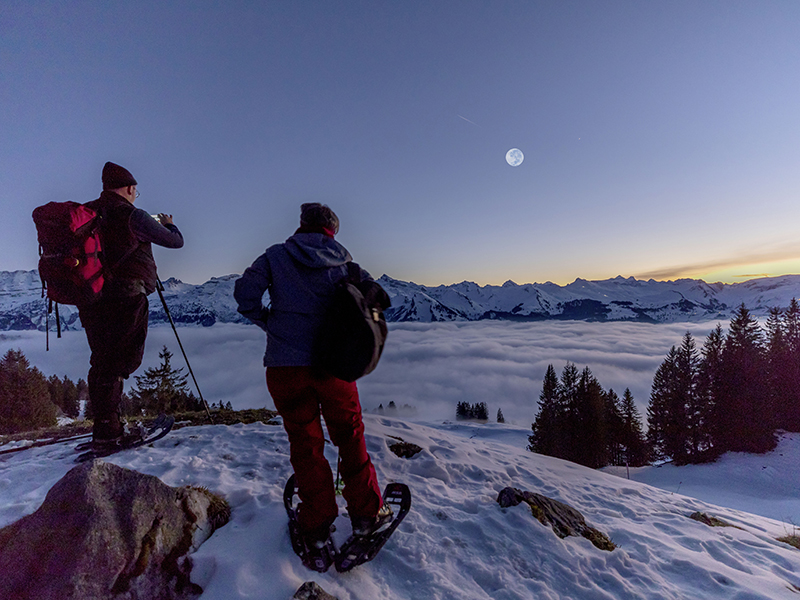 Instruktion und Begleitung durch Guide, Schneeschuhe, Stöcke und Stirnlampe.