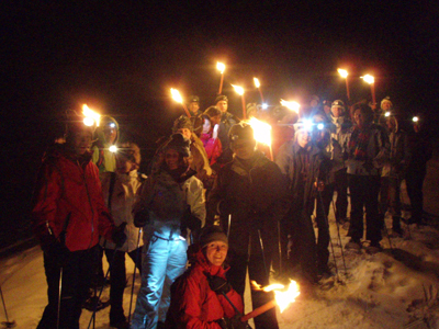 Die Fackeltour ist ein Erlebnis mit Abenteuercharakter. Mit den Schneeschuhen und den Fackeln wandern wir durch die verschneite, glitzernde Schneelandschaft. Unter deinen Füssen knirscht leise der Schnee und durch die Feuerfackeln erleben wir eine märchenhafte Stimmung.
